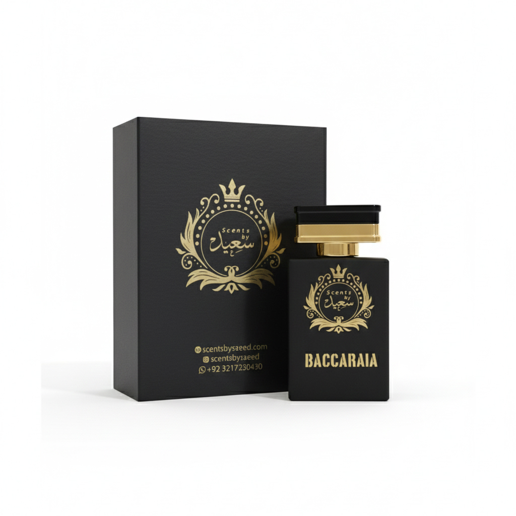 Baccaraia is a refined and radiant fragrance inspired by Baccarat Rouge 540. It opens with the rich warmth of saffron and delicate jasmine, leading into an amber heart that glows with depth and allure. The base of cedarwood and fir resin adds a soft woody finish, creating a long-lasting scent that’s both elegant and intoxicating — perfect for those who embrace sophistication with confidence.